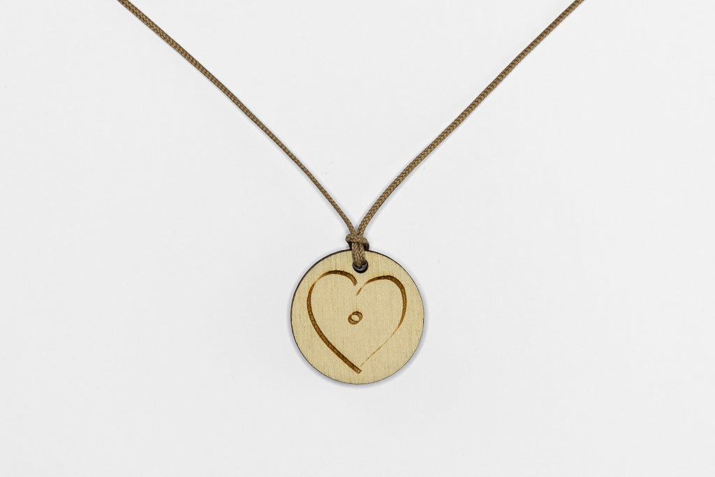 Round wooden jewelry pendant with laser-engraved Quelle symbol packaged in a small paper bag made of recycled material.