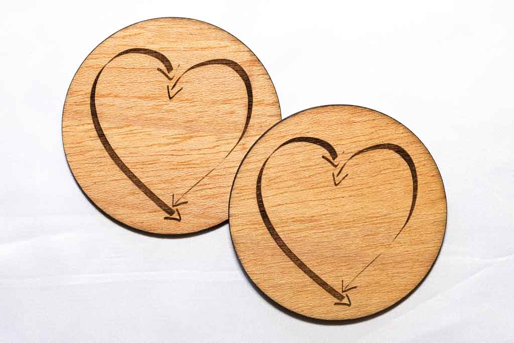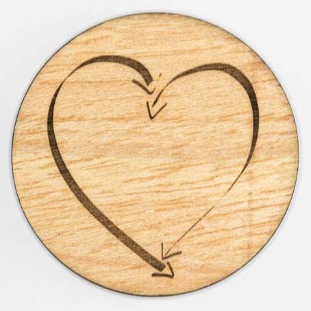 Round wooden coaster with laser-engraved HeartEase® transformation symbol.