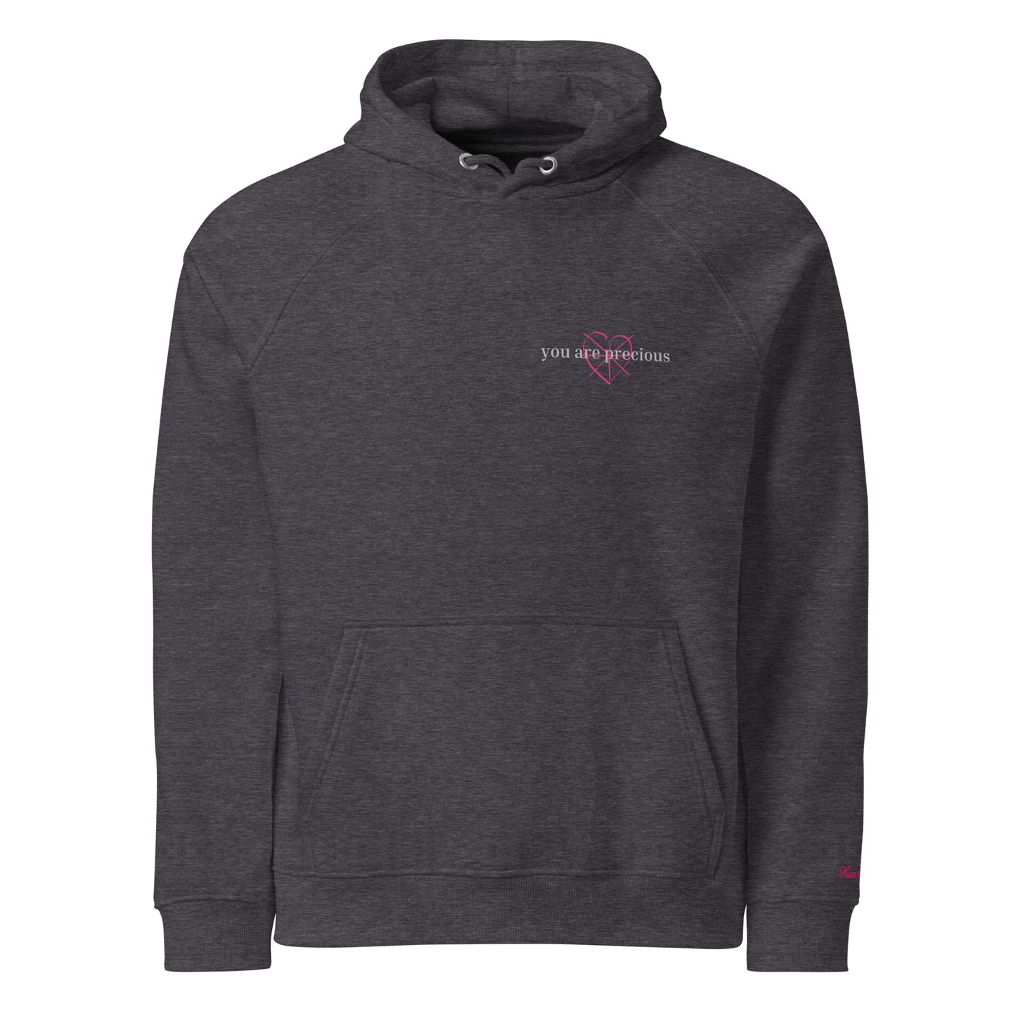 Sudadera con capucha raglán - Corazón 'Sanando' y eres precioso (parte delantera; orgánica, unisex)