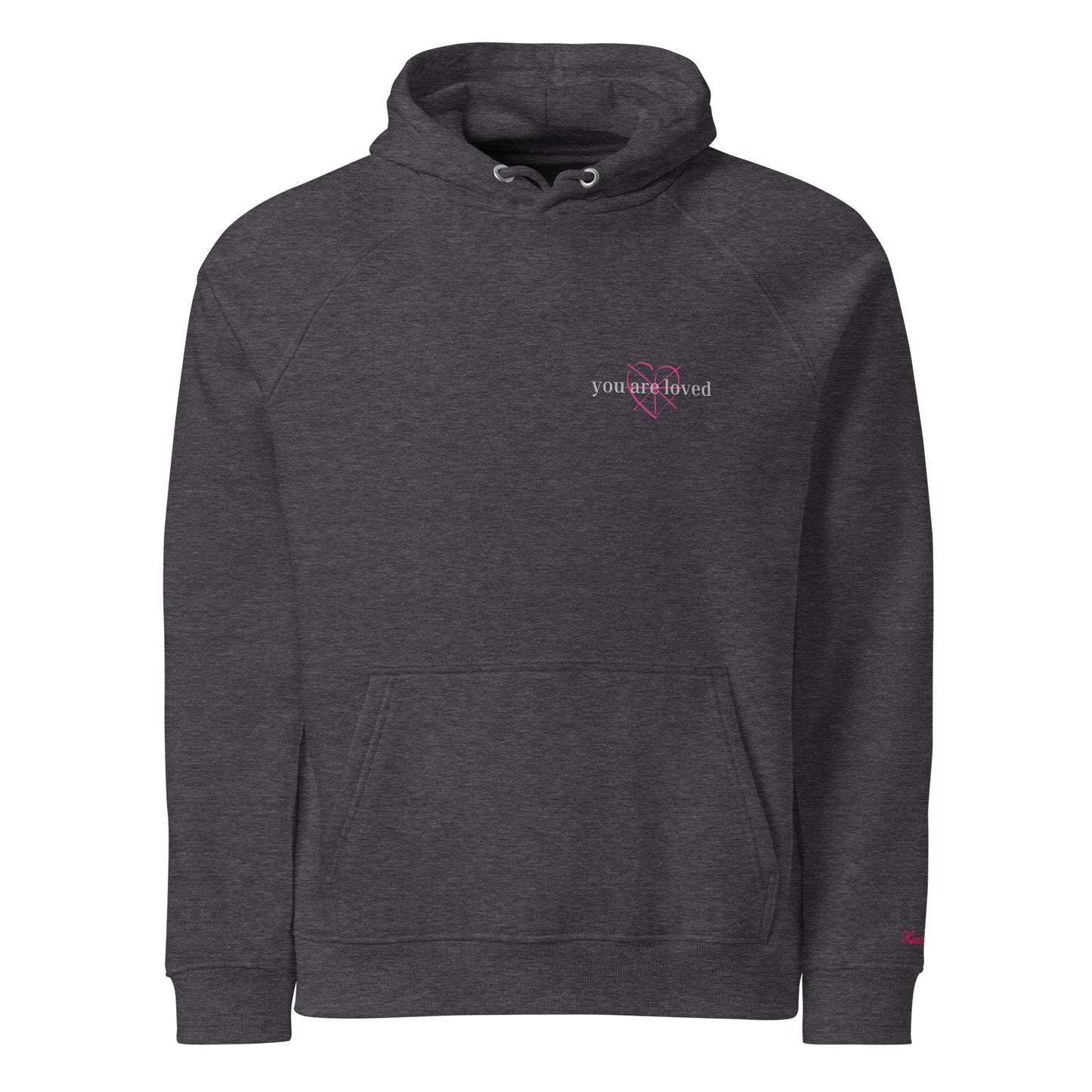 Sudadera con capucha raglán - Corazón 'Sanando' y eres amado (parte delantera; orgánica, unisex)