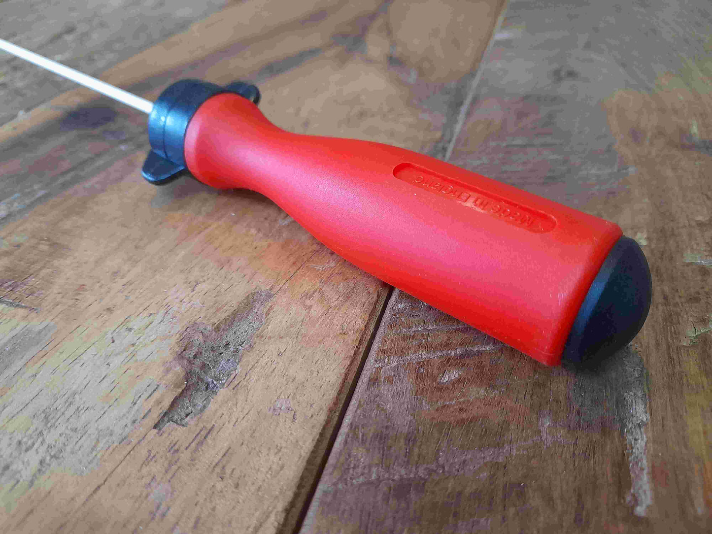 Der extrem leichte rot-schwarze Handgriff ist ein Produkt der Fa. Oregon, ausgelegt auf eine ergonomische Handhabung.