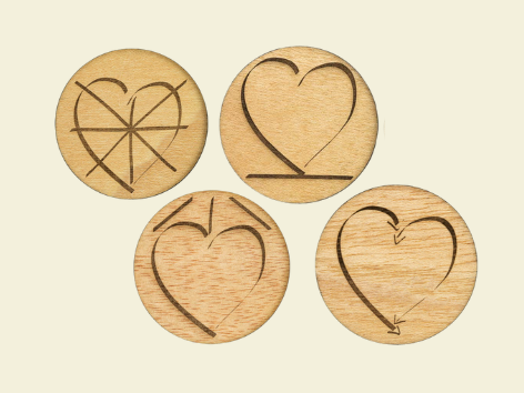 Alle 4 Holz-Untersetzer mit den gängigsten HeartEase® Herz-Symbolen in einem Set zum Vorteilspreis.
